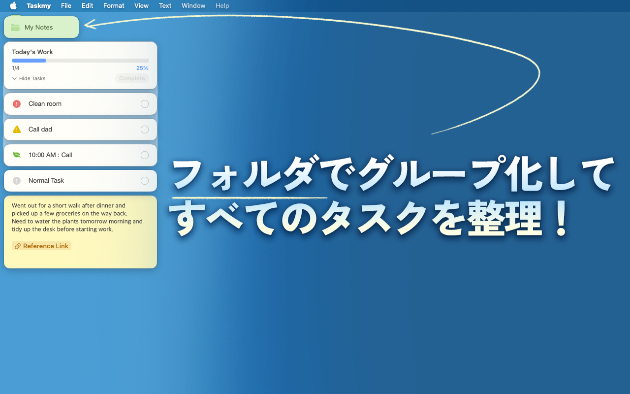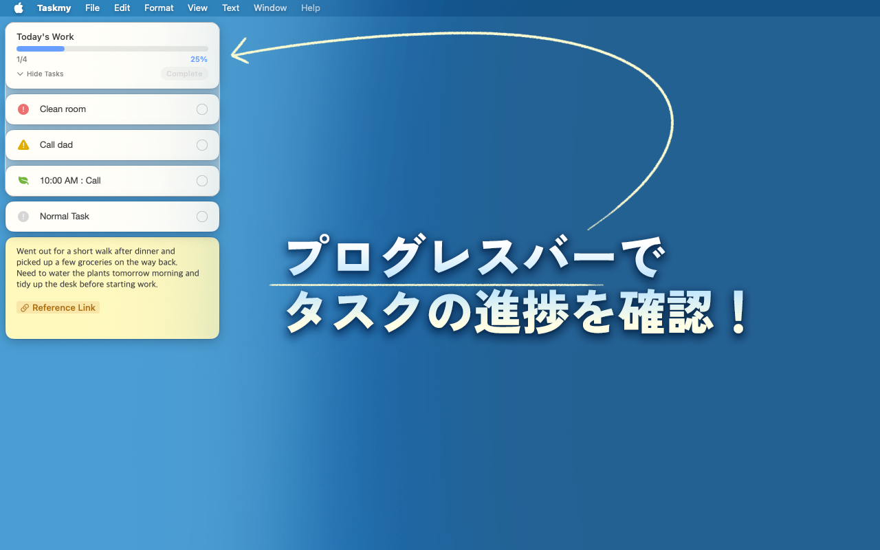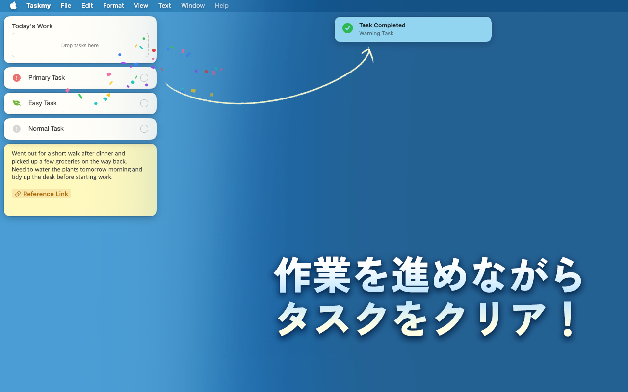 Taskmy は、タブやウィンドウに埋もれずに働きたい人のための macOS 向けタスク管理・プロジェクト整理アプリです。 ブラウザ、チャット、ドキュメント、制作ツールはそのままに、 プロジェクトだけを専用の背景ワークスペースで管理できます。 ルーティンを設定し、進捗を追跡し、フォルダで整理し、 リンクを見やすいバッジに変換し、必要なときはタスクをデスクトップに固定できます。 巨大な管理ツールを世話する時間を減らし、 実際のプロジェクトを前に進める時間を増やせます。