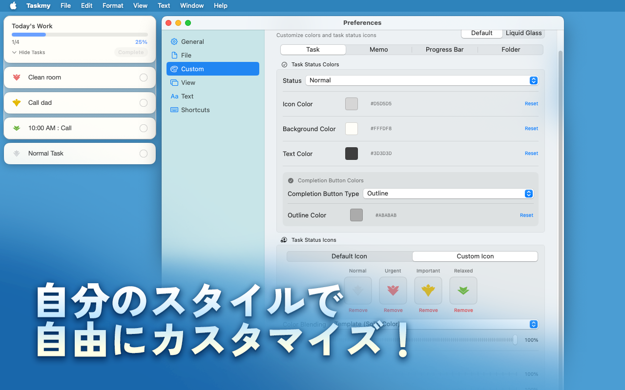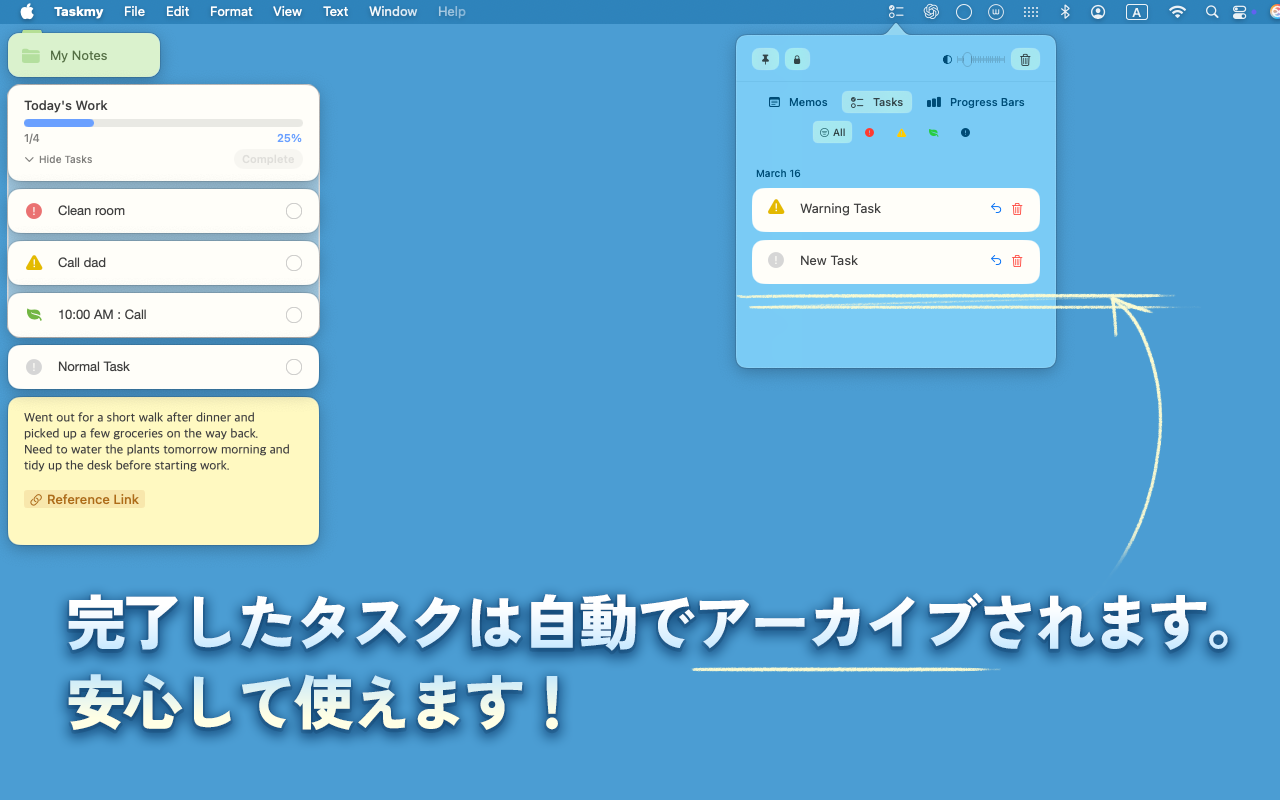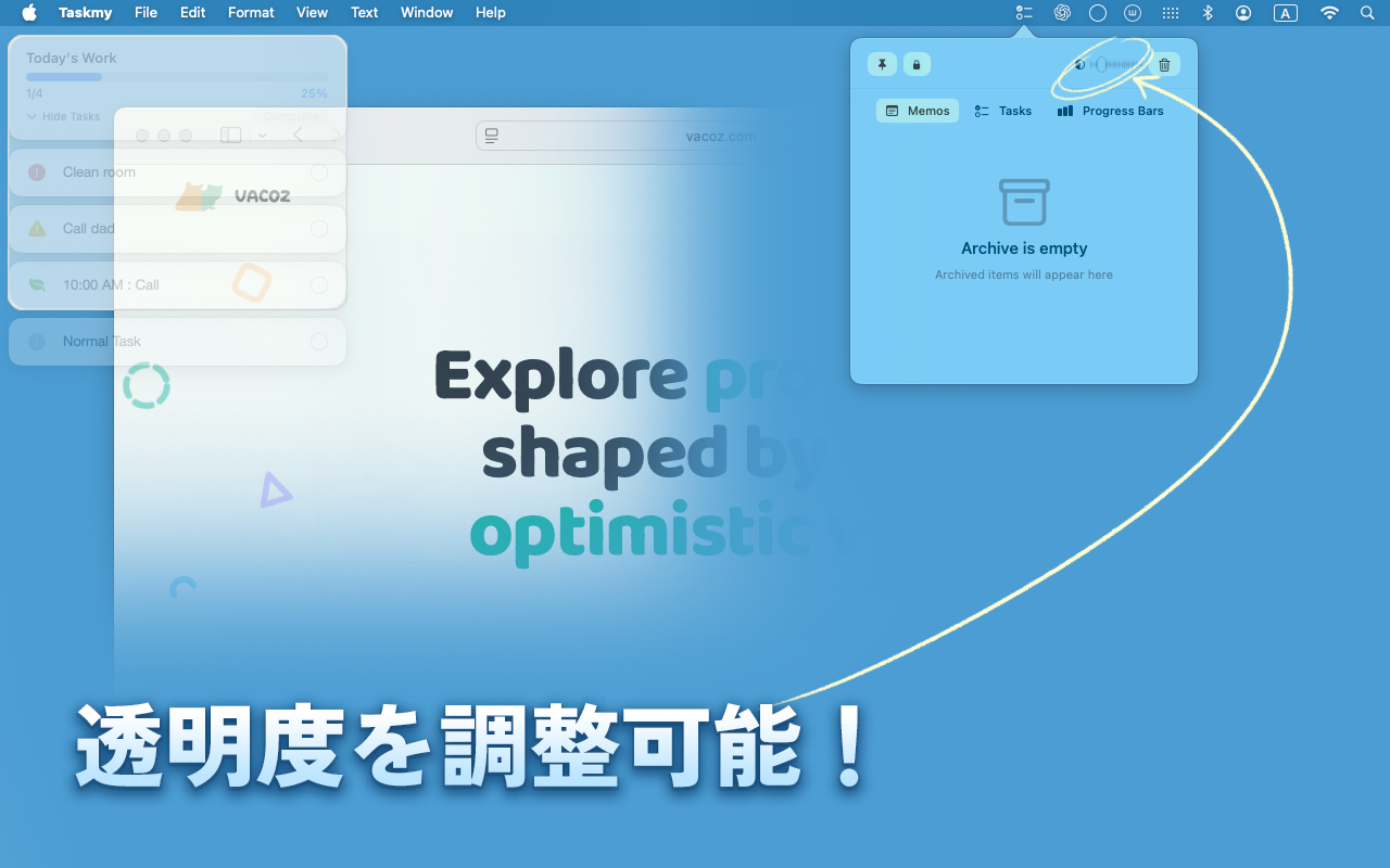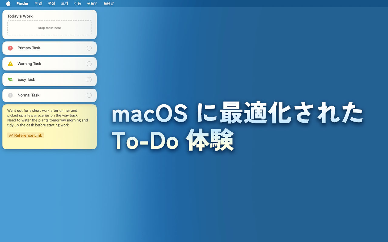 Taskmy は、タブやウィンドウに埋もれずに働きたい人のための macOS 向けタスク管理・プロジェクト整理アプリです。 ブラウザ、チャット、ドキュメント、制作ツールはそのままに、 プロジェクトだけを専用の背景ワークスペースで管理できます。 ルーティンを設定し、進捗を追跡し、フォルダで整理し、 リンクを見やすいバッジに変換し、必要なときはタスクをデスクトップに固定できます。 巨大な管理ツールを世話する時間を減らし、 実際のプロジェクトを前に進める時間を増やせます。