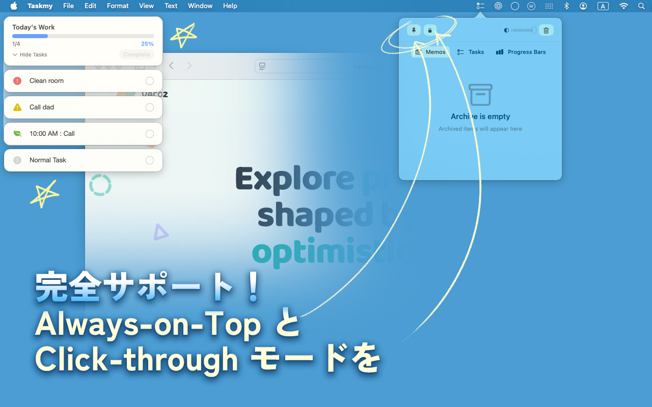 タスクやメモをデスクトップに浮かべて、 他のアプリを使いながらも確認できます。